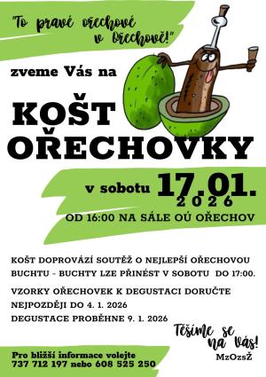 Zveme vás na košt ořechovky, který se koná v sobotu 17. ledna 2026 od 16:00 na sále Obecního úřadu Ořechov. Součástí akce bude soutěž o nejlepší ořechovou buchtu, přičemž buchty lze přinést do 17:00. K degustaci je nutné doručit vzorky ořechovek nejpozději do 4. ledna 2026.
