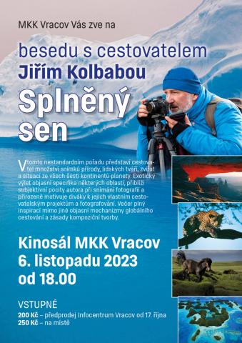 Městský kulturní klub Vracov Vás zve na besedu s cestovatelem Jiřím Kolbabou s názvem "Splněný sen", a to v pondělí 6. listopadu v 18:00 v kinosále MKK Vracov.