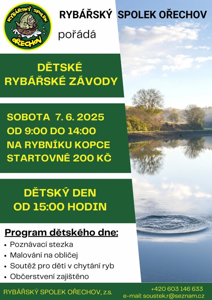 Rybářský spolek Ořechov zve všechny děti na Dětský den, který se uskuteční v sobotu 7. června 2025 od 9:00 do 14:00 na rybníku Kopce. Program zahrnuje malování na obličej, poznávací stezku a soutěž v chytání ryb. Startovné činí 200 Kč a občerstvení bude zajištěno.