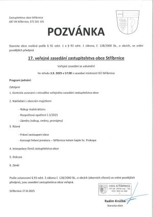 Starosta obce Stříbrnice svolává 18. VZO Stříbrnice na středu 22.10.2025 v 17:00 hodin v zasedací místnosti OÚ Stříbrnice. Program jednání je zveřejněn na úřední desce obce.