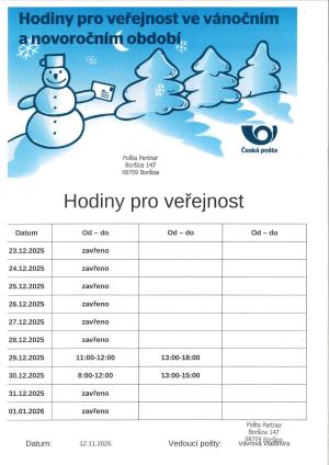 Pošta Partner v Boršicích oznamuje změny v provozních hodinách během vánočních svátků. Od 23. do 28. prosince 2025 bude pošta uzavřena, a to včetně Štědrého dne. Otevřena bude 29.12. od 11:00 do 12:00 a od 13:00 do 18:00 a 30.12. od 08:00 do 12:00 a od 13:00 do 15:00 hodin.