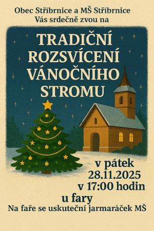 Obec Stříbrnice a MŠ Stříbrnice vás srdečně zvou na tradiční rozsvícení vánočního stromečku s jarmarkem Mateřské školy Stříbrnice, které se uskuteční v pátek 28.11.2025 u fary od 17:00 hodin.