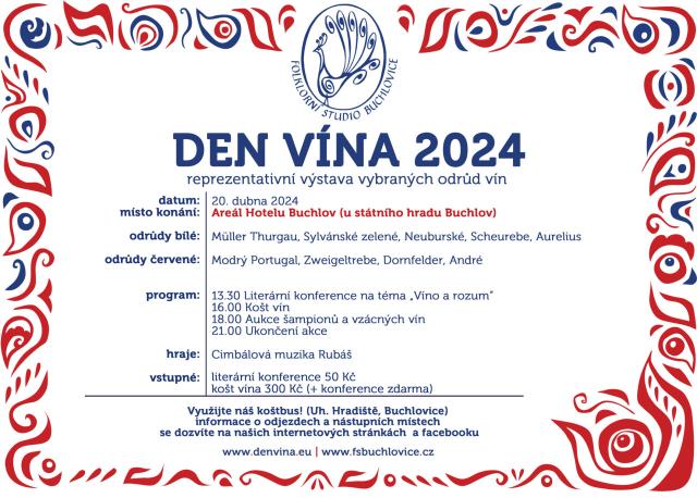 Folklorní Studio Buchlovice si Vás srdečně dovoluje pozvat na DEN VÍNA, který se bude konat v sobotu 20. dubna 2024 v areálu Hotelu Buchlov. Budete mít možnost vybírat ze stovek vzorků vín z koutů celé České republiky. Čekají na Vás odrůdy bílé - Müller Thurgau, Sylvánské zelené, Neuburské, Scheurebe a Aurelius. A také odrůdy červených vín - Modrý Portugal, Zweigeltrebe, Dornfelder a André.
