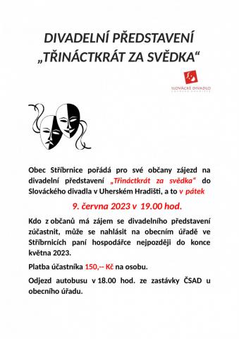 Obec Stříbrnice pořádá pro své občany zájezd na divadelní představení „Třináctkrát za svědka“ do Slováckého divadla v Uherském Hradišti a to v pátek 9. června 2023 v 19.00 hod.