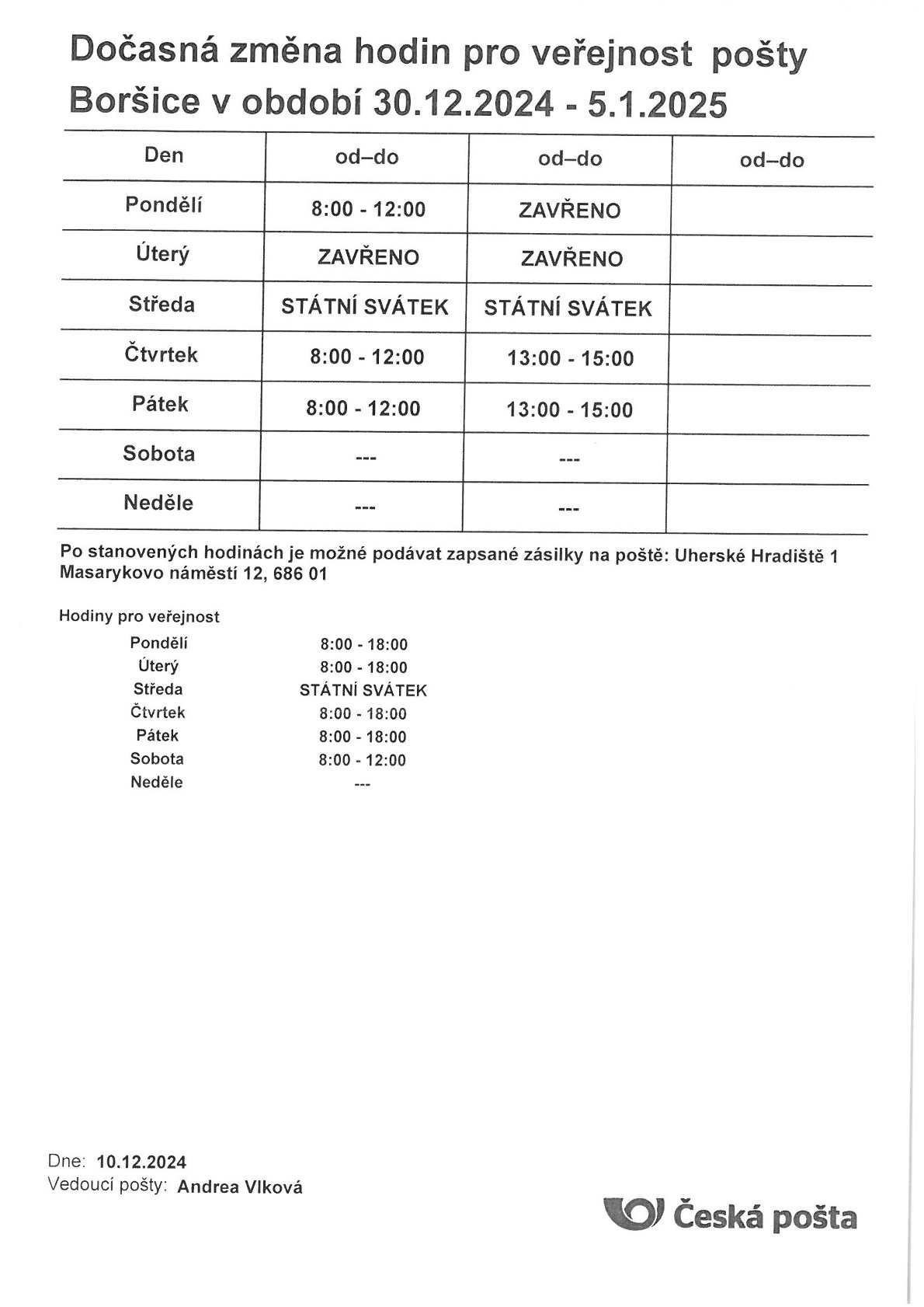 Dočasná změna hodin pro veřejnost od 23.12.-5.1.2024 Pošta Boršice