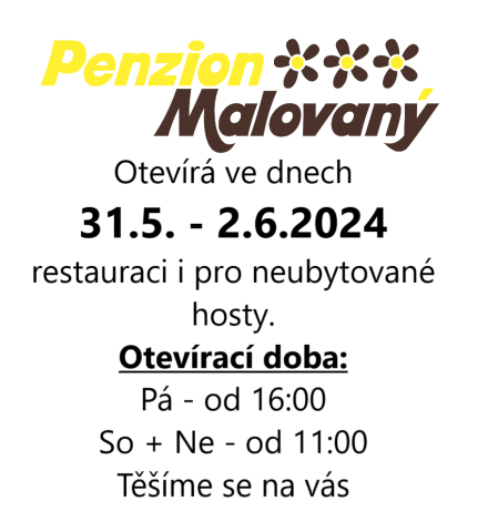 Penzion Malovaný Osvětimany otevírá ve dnech 31.5. - 2.6.2024 restauraci i pro neubytované hosty. Otevřeno v pátek od 16h a So+Ne od 11h.