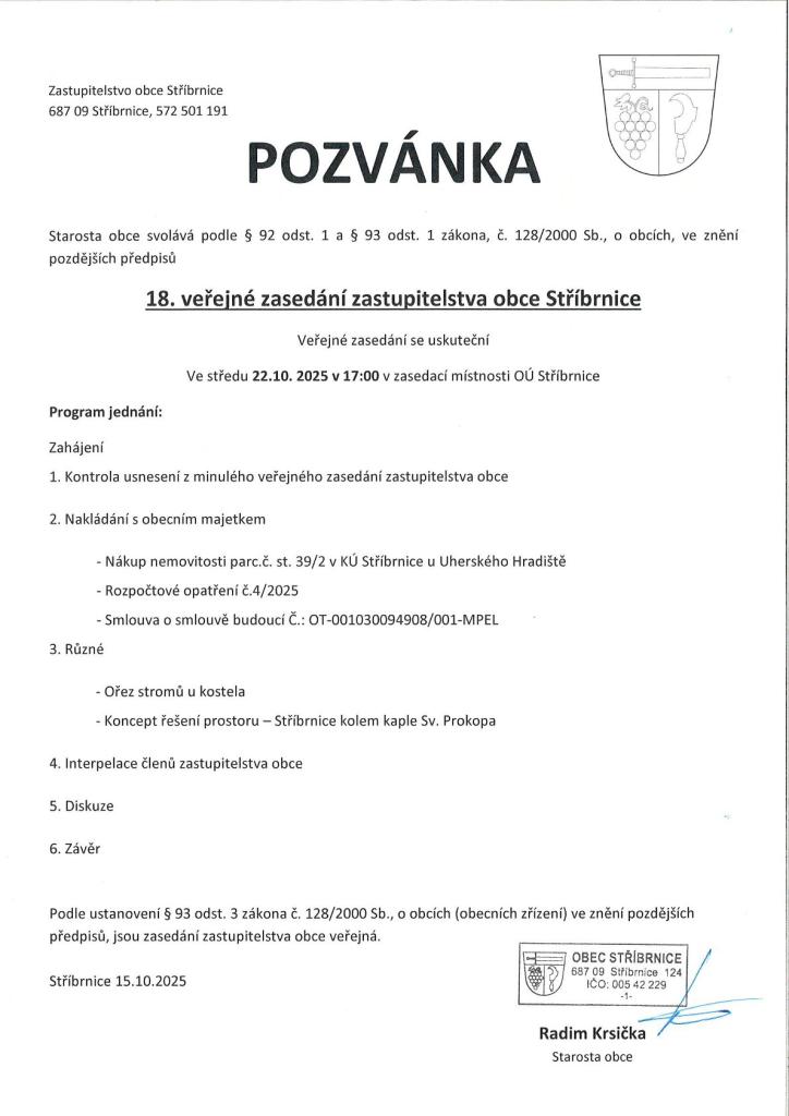 Starosta obce Stříbrnice svolává 18. VZO Stříbrnice na středu 22.10.2025 v 17:00 hodin v zasedací místnosti OÚ Stříbrnice. Program jednání je zveřejněn na úřední desce obce.