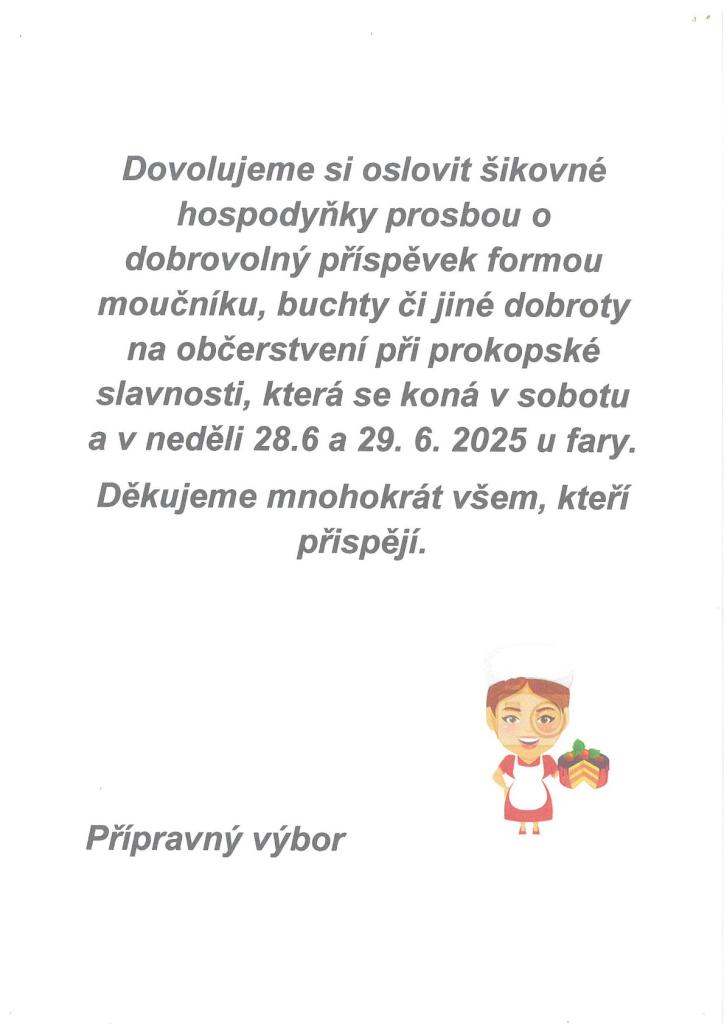 Dovolujeme si oslovit šikovné hospodyňky s prosbou o dobrovolný příspěvek formou moučníku, buchty či jiné dobroty na občerstvení při prokopské slavnosti. Tato akce se uskuteční v sobotu a v neděli 28. a 29. června 2025 u fary. Děkujeme mnohokrát všem, kteří se rozhodnou přispět a podílet se na této slavnosti.