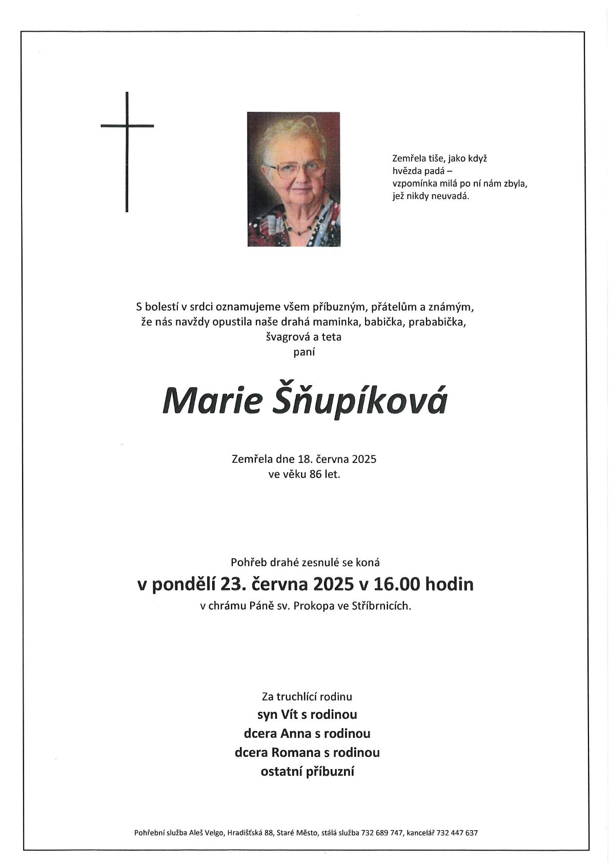 Rozloučení s drahou zesnulou se koná v pondělí 23.června 2025 v 16:00 hodin v chrámu Páně sv. Prokopa ve Stříbrnicích.