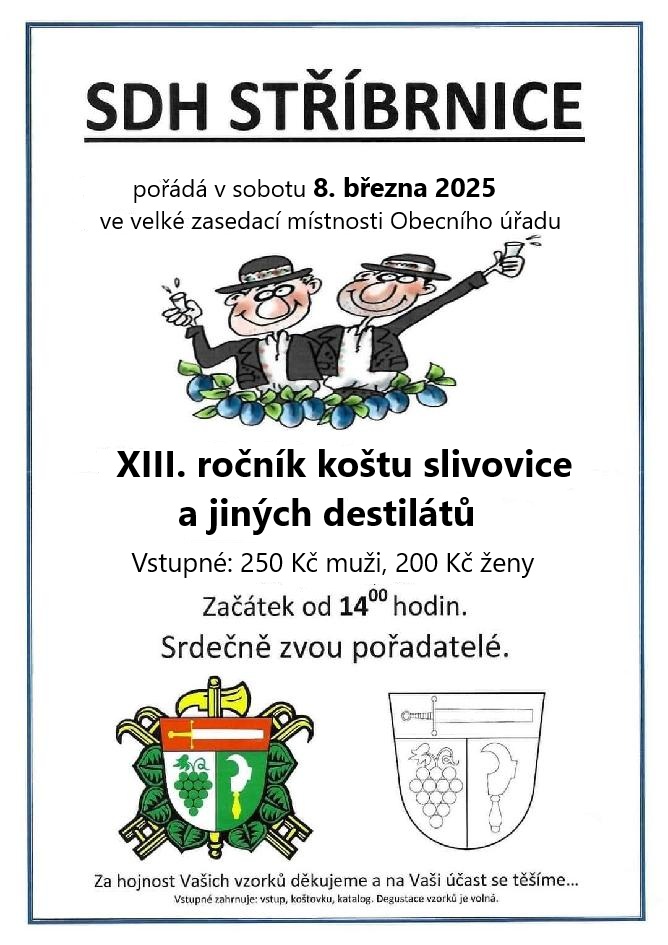SDH Stříbrnice pořádá XIII. ročník Koštu slivovice a jiných destilátů v sobotu 8.3.2025 ve velké zasedací místnosti OÚ Stříbrnice od 14:00 hodin. Vstupné 250,- Kč, ženy 200,- Kč.