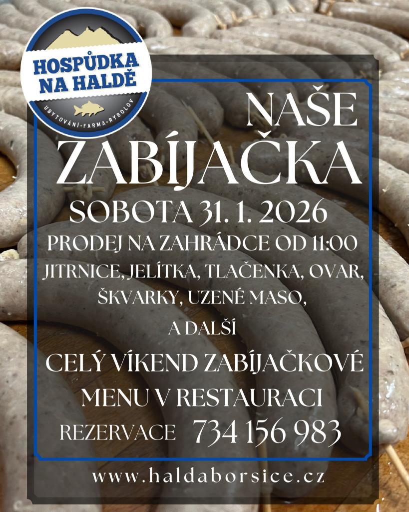Hospůdka na Haldě si pro Vás připravila v sobotu 31.1.2026 od 11:00 prodej tradičních zabíjačkových specialit. Těšit se můžete jako obvykle na jitrnice, jelítka, tlačenku, škvarky, domácí uzené a mnoho dalšího. Po celý víkend budeme v restauraci nabízet zabíjačkové menu. Rezervace na tel. 734156983.
