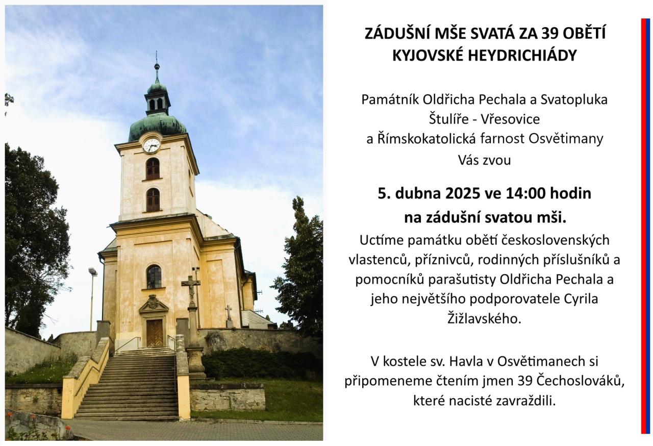 Zveme vás na zádušní svatou mši, která se koná 5. dubna 2025 v 14:00 hodin v kostele sv. Havla v Osvětimanech. Uctíme památku obětí kyjovské heydrichiády, přičemž si připomeneme jména 39 Čechoslováků, které nacisté zavraždili.