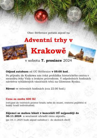 Odjezd autobusu od OÚ Stříbrnice v 05:00 hod.. Po příjezdu do Krakowa nás čeká prohlídka historického centra v meandru řeky Visly s českým průvodcem. V odpoledních hodinách návštěva vyhlášených vánočních trhů na Glownem Rynku.