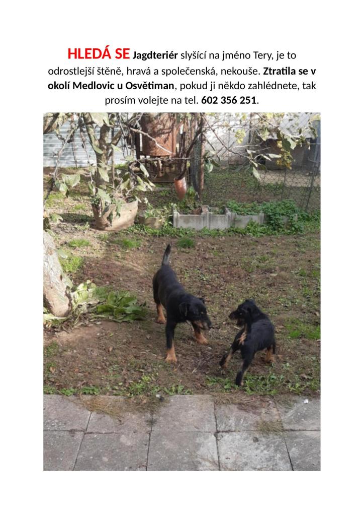 Hledá se Jagdteriér slyšící na jméno Tery,je to odrostlejší štěně, hravá a společenská, nekouše. Ztratila se v okolí Medlovic u Osvětiman,pokud ji někdo zahlédnete,tak prosím volejte na tel 602356251